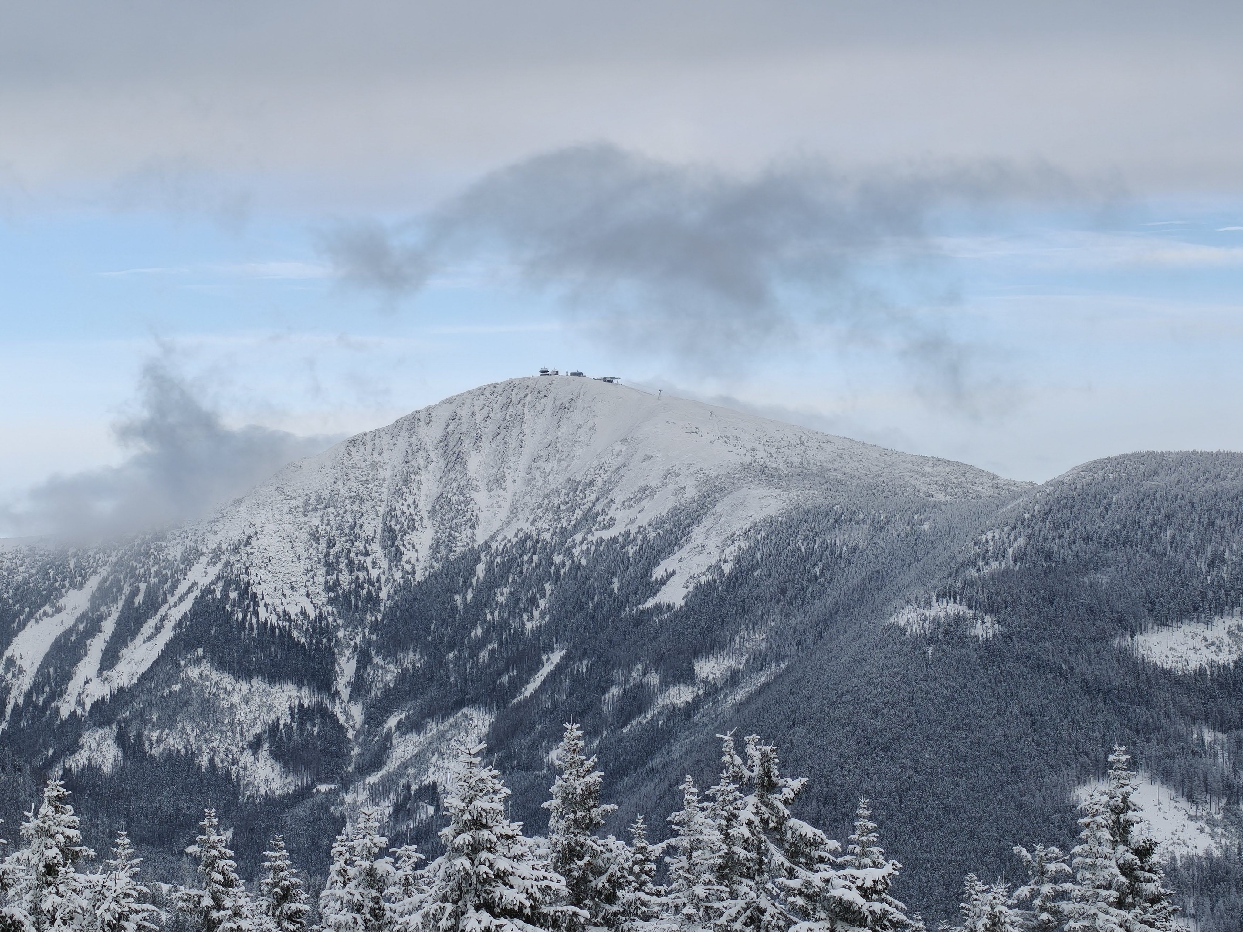 Katastrofické předpovědi počasí se naštěstí nevyplnily, byl sice mráz, ale nijak dramatický, a dokonce odpoledne se na nás z oblohy smálo sluníčko. I když na Sněžce to fičelo vydatně, ale tam to je běžný standard.